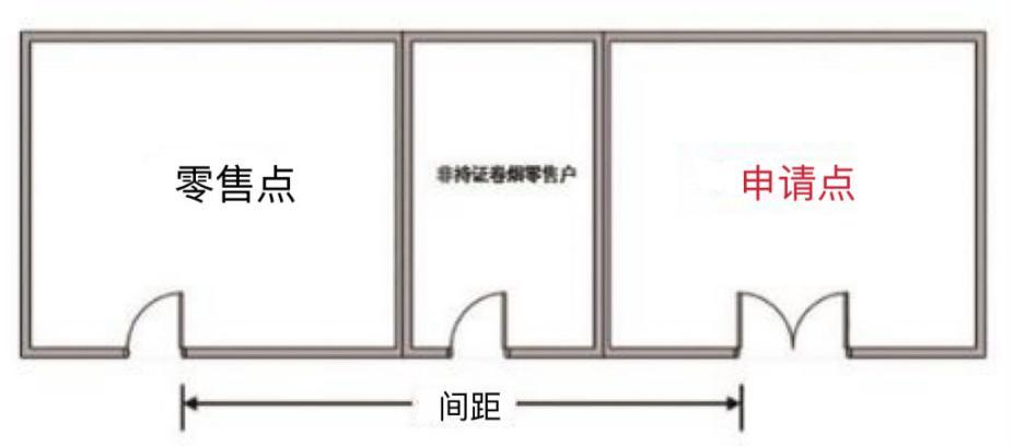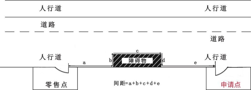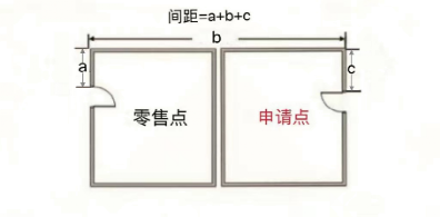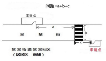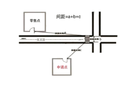 (三)“零售点间距”是指申请点与参照零售点(周边已设最近的零售点)之间按“门边到门边”原则进行测量。测量数据精确到小数点后一位,如“30.0米”或“100.0米”。