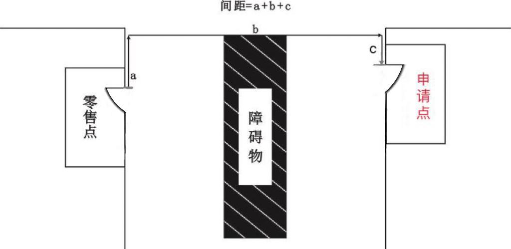 (四)申请点与参照零售点异侧存在障碍物的,测量按直角分段绕过障碍物测量,分段距离之和即为申请人的经营场所与最近零售点的经营场所间的距离。间距=a+b+c(如图4)