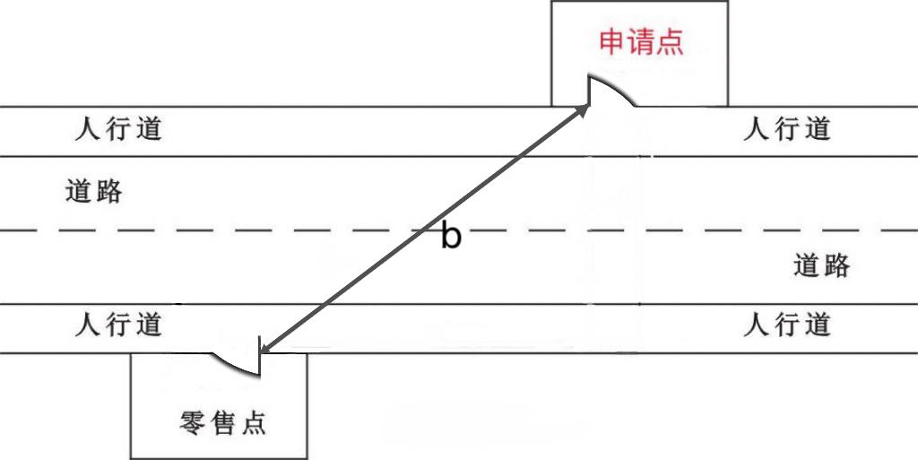 申请点与参照零售点位于十字路口对角位置的,且路口中间设有交通信号灯、人行横道或过街设施的,应按照交通规则,通过人行横道或过街设施,按申请点门边至零售点门边可安全步行最短距离测量。(如图7.2中存在a、b两条线路,取其中一条可安全步行最短距离线路测量)