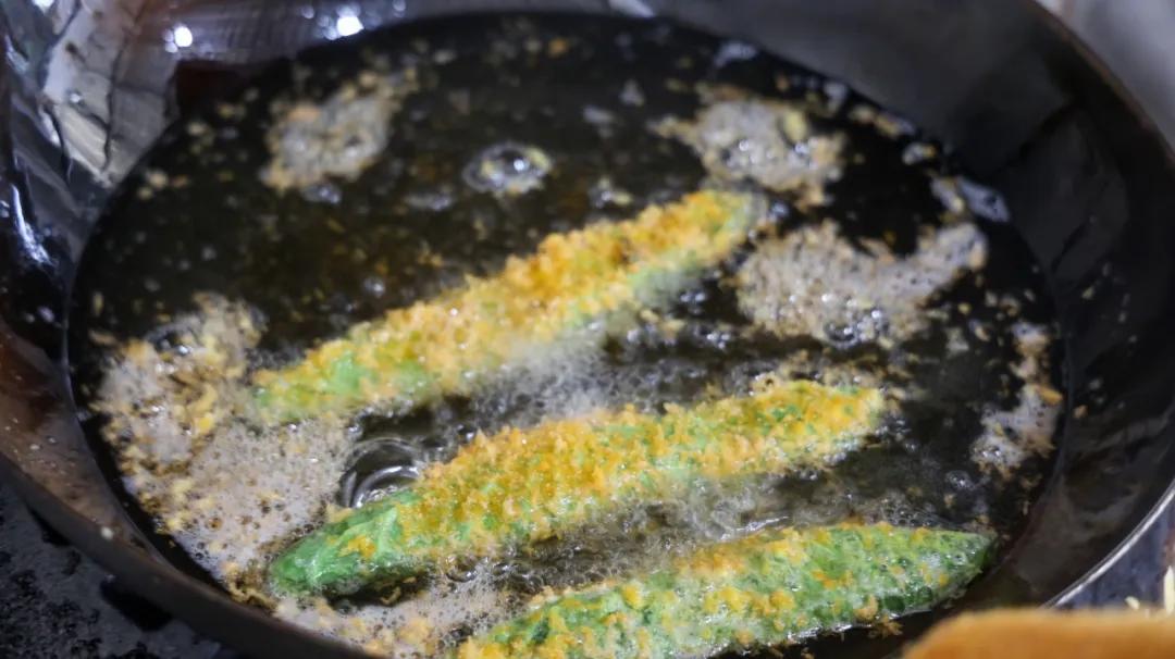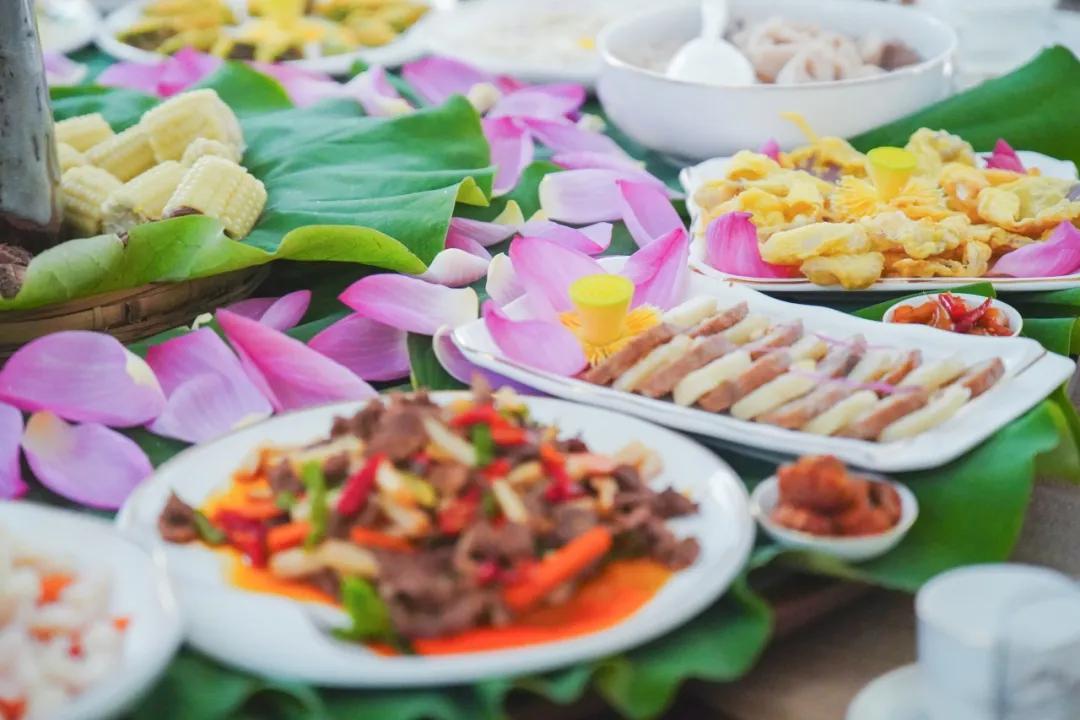 除了欣赏荷塘美景,团山景区还结合当地特色推出了荷花宴。为保证食材新鲜,用于荷花宴的所有荷叶、荷花、莲蓬都是当天采摘,紧接着就被送到乡愁餐厅备菜。每一道菜的制作过程十分复杂,比如将配置好的肉末用刚采摘的荷叶卷起,再裹满面包糠,炸至金黄,最后再切成小段,一盘荷叶春卷就完成了。