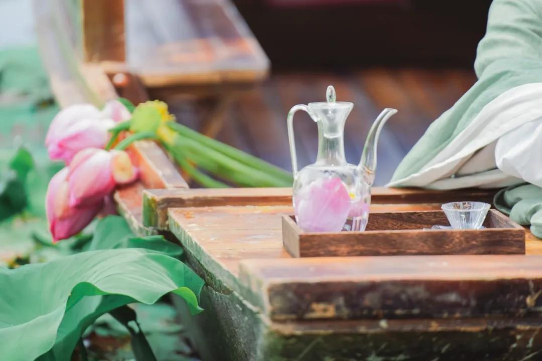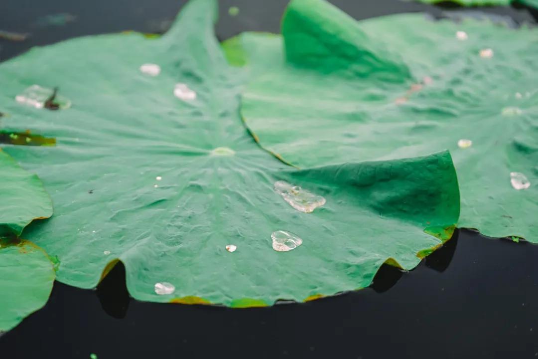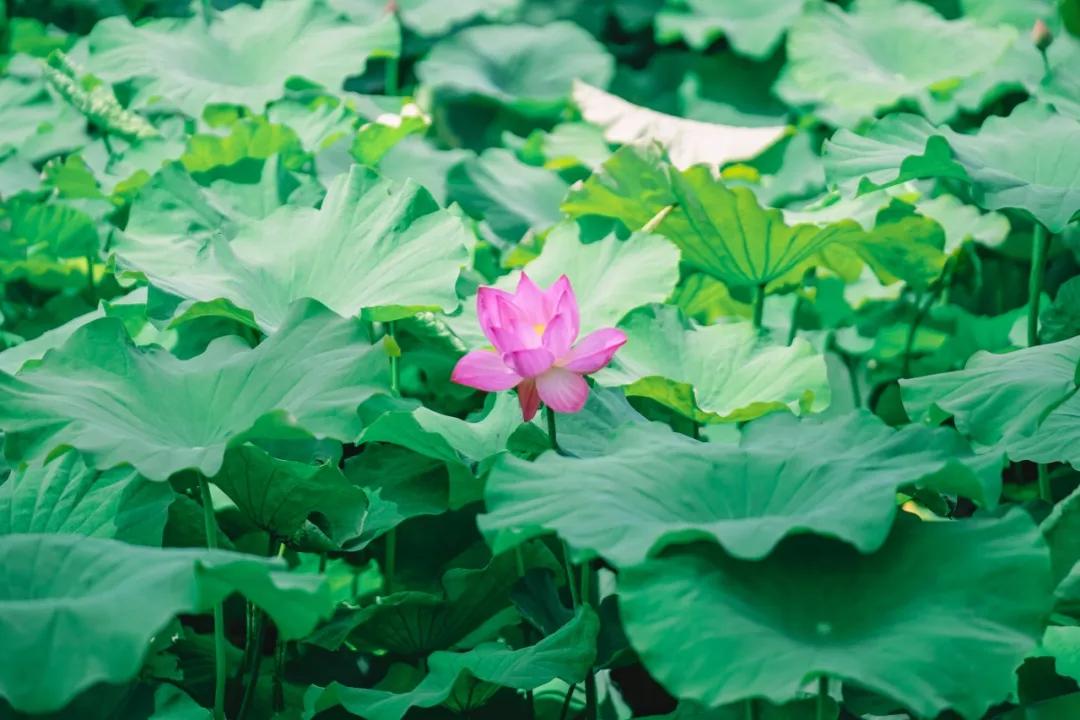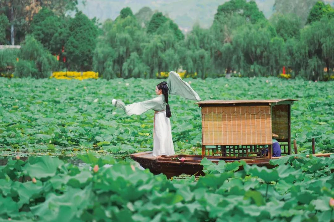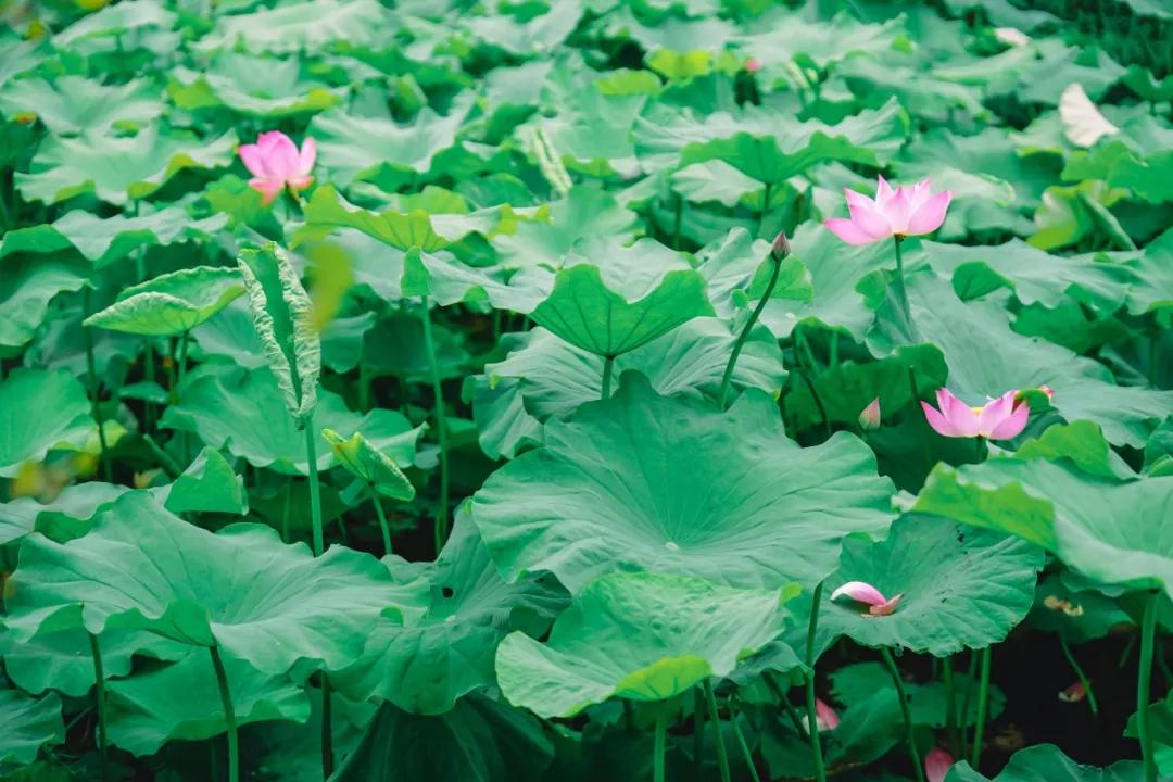 微风拂过,空气中传来阵阵清香,荷叶间互相碰撞,伴随着蝉鸣声、鸟鸣声,演奏着夏日的乐章。赏荷若是仅止步于荷塘边,显然不够尽兴,时而有游客,乘着一叶孤舟荡漾在荷塘中,或是静坐在舟头,酌一盏荷花泡的清茶;又或是往深处开去,近距离欣赏荷塘美色。