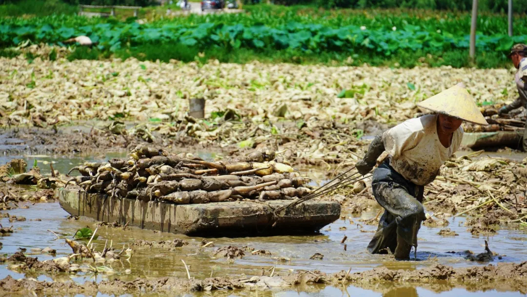 西庄镇荒地村委会金华寺村莲藕采挖现场,柴油机轰鸣,藕农们正在藕田里的淤泥深处踱步、试探,仔细摸索后,或俯身在水中,或使用铁铲,或借助高压水枪,熟练地将一根根莲藕拔出泥潭。杨冠南家有30亩藕田,因为莲藕经济效益可观,他已经种植了20多年。