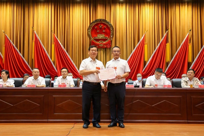 在热烈的气氛中,赵雄为新当选的县人民政府县长钟红荘颁发了当选证书,杨建伟为新当选的县监察委员会主任赵刚及县第十六届人大常委会委员颁发了当选证书。