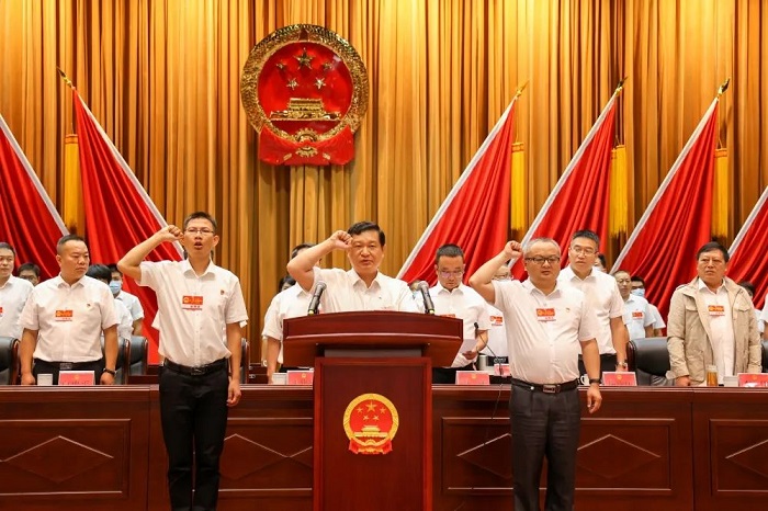 新当选的县人民政府县长、县监察委员会主任、县第十六届人大常委会委员向《中华人民共和国宪法》宣誓,钟红荘领誓。
