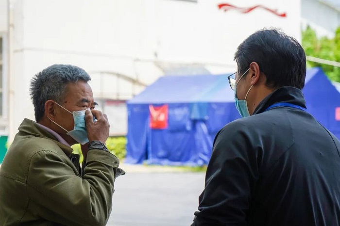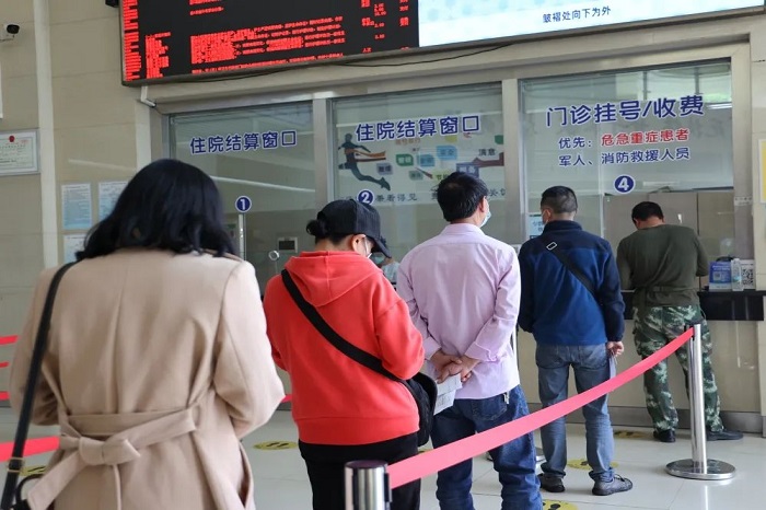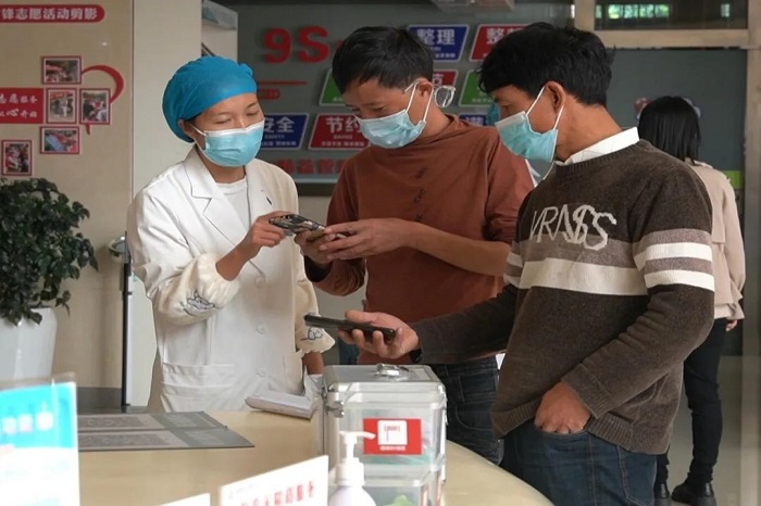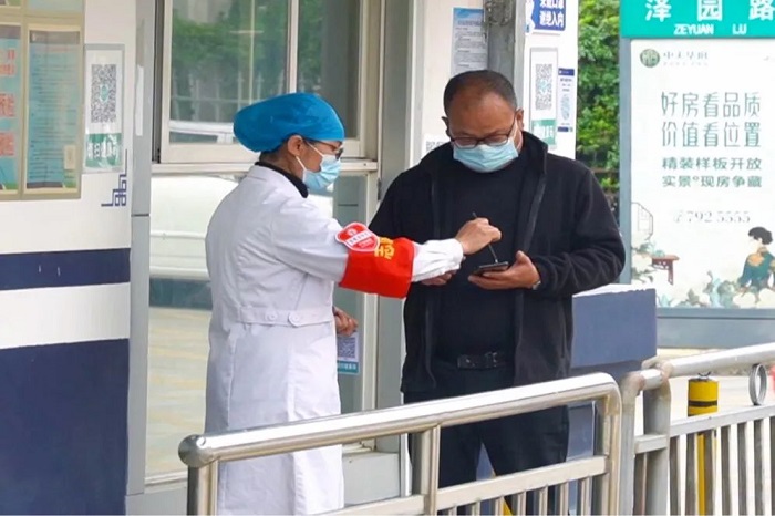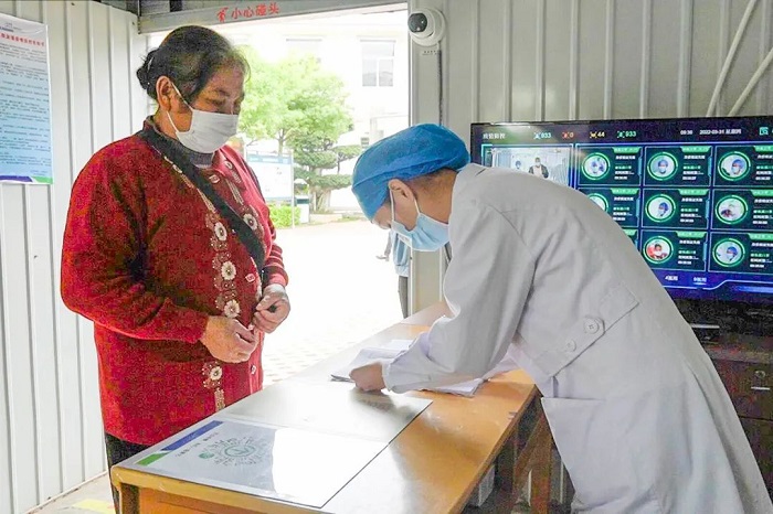 在医院入口处,设置了扫码测温查验点,进入院区的人员必须扫码测温,经工作人员核验相关信息后方可入院,并针对无智能手机的老年人设置了人工登记点。