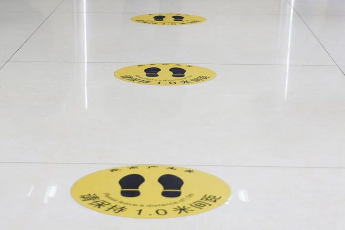 为确保患者在医院内顺利、安全诊疗,医院在挂号收费处粘贴标识,提醒排队人员须与他人保持,一米以上的安全社交距离等候。