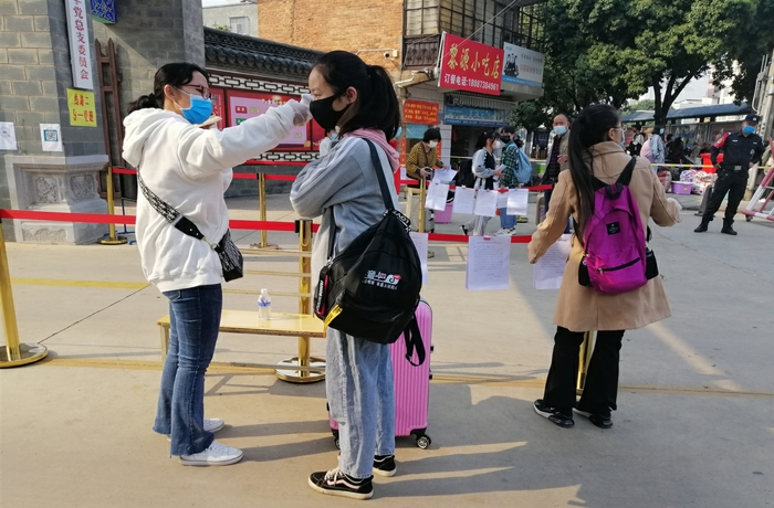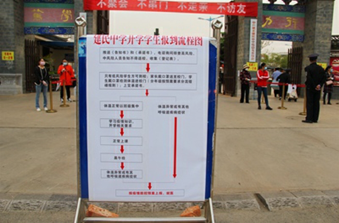学生分批陆续从四个通道分流入校,校门口设置了登记处,家长不得进入校园,学生戴口罩、测体温,签署健康承诺书,仪容仪表检查,经过行李消杀后方可进入校园,教师们用推车帮学生拉运行李。学生入校后,将进行每天早中晚三次测温并上报,自带餐具、分批吃饭,住校生将实施封闭管理。