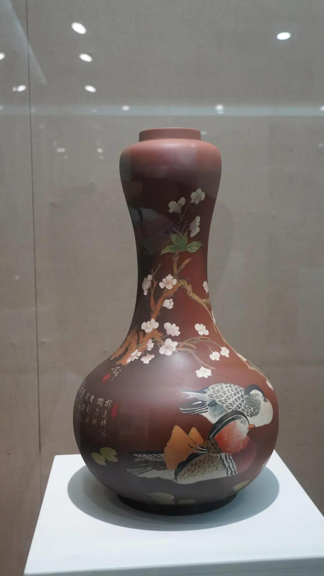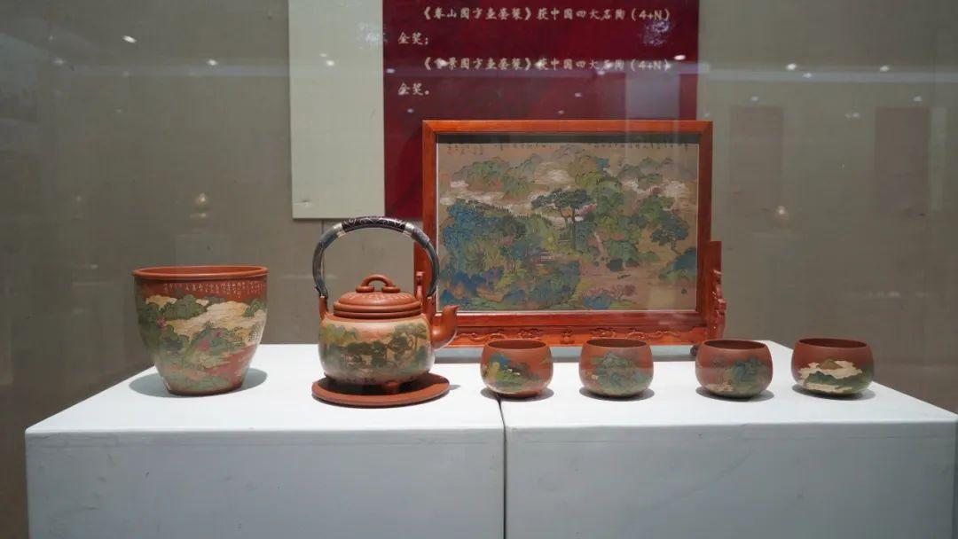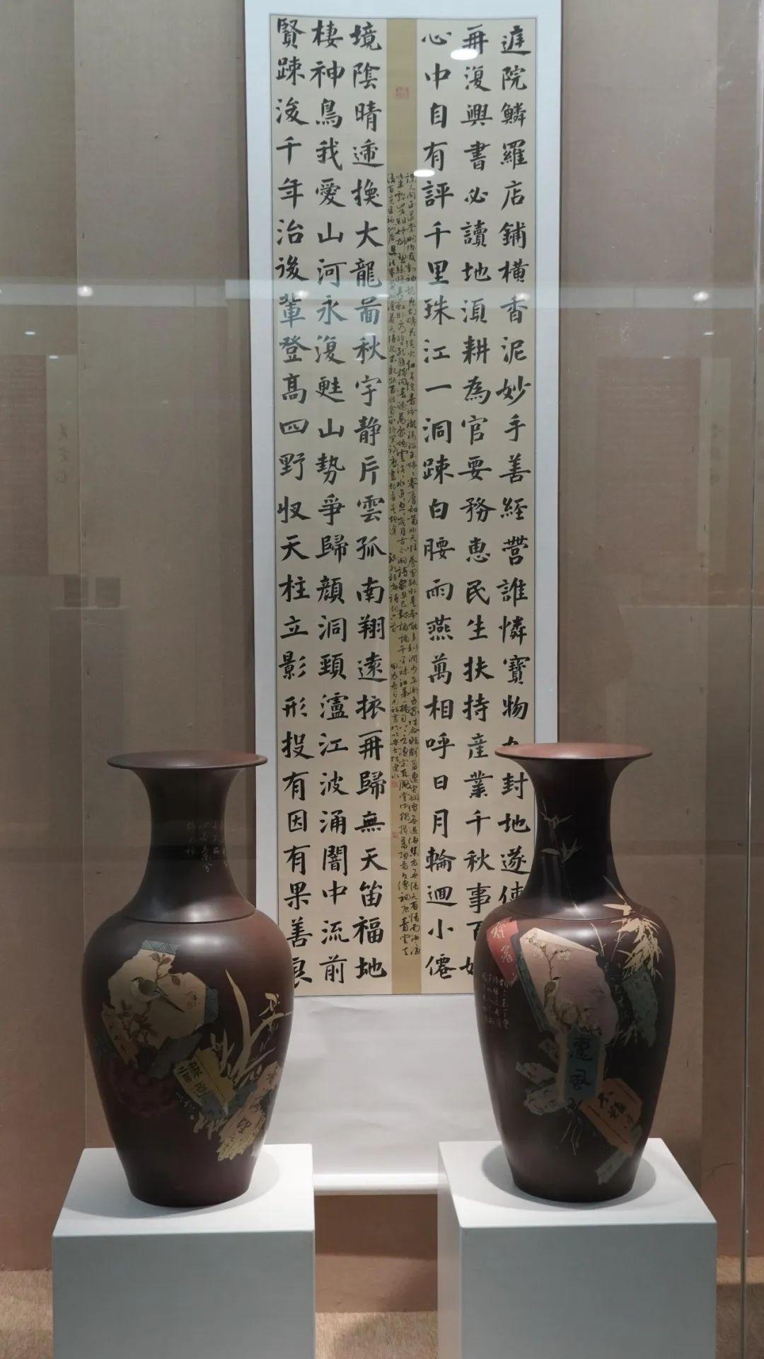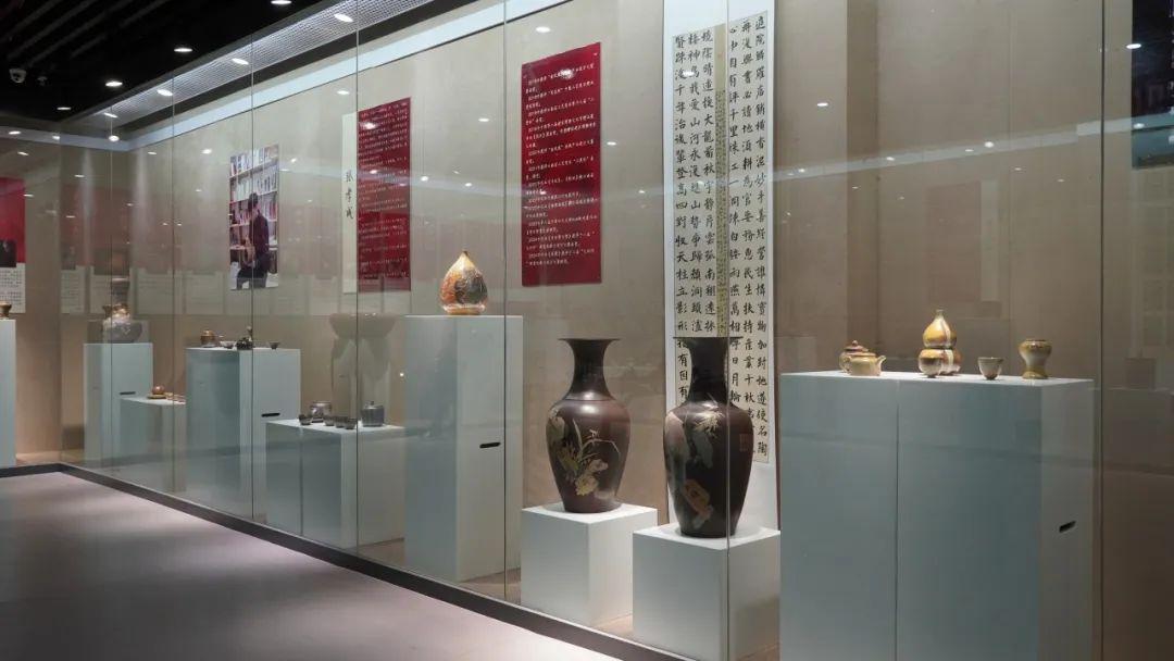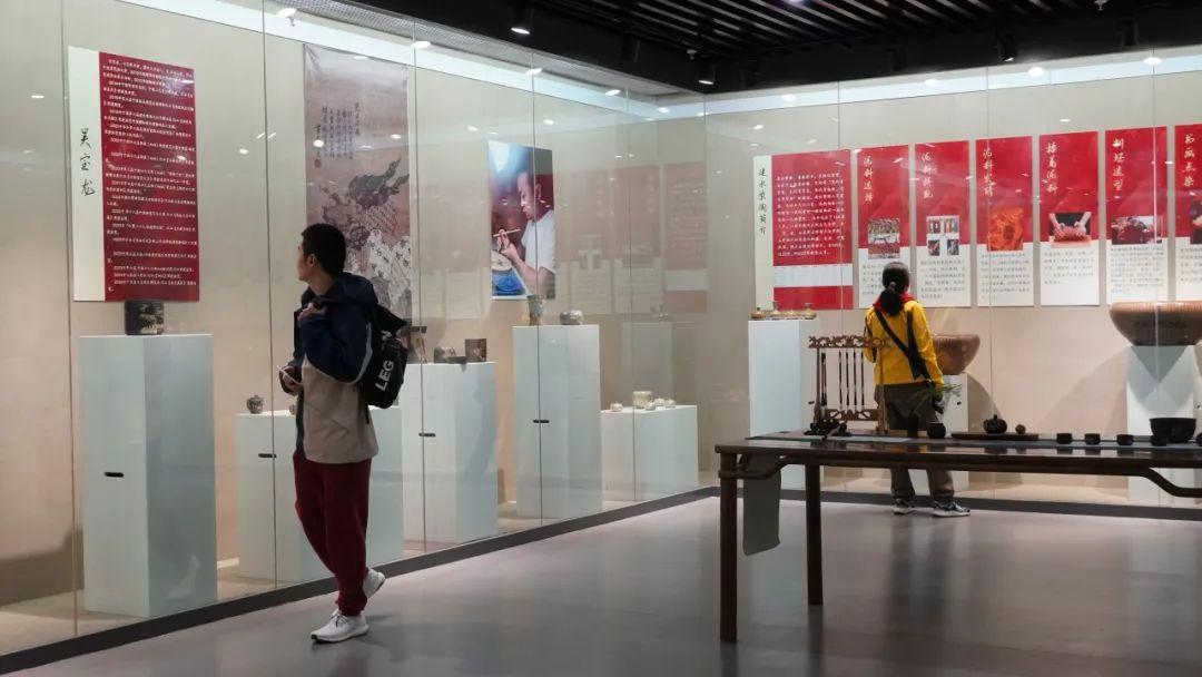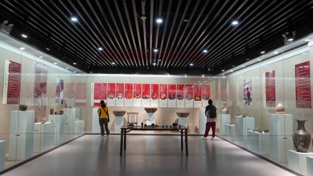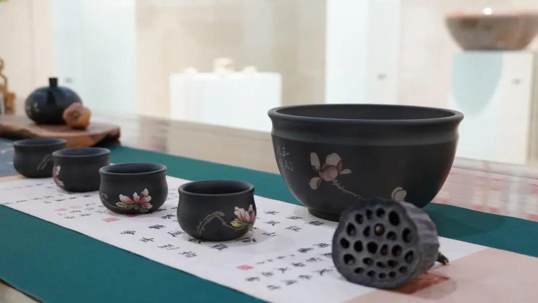 创意展厅,观众可近距离欣赏到建水紫陶的多样形态与精湛工艺。展品涵盖茶器、陈设器等类别,精湛的制作技艺、细腻的装饰纹理和独特的造型,展现了紫陶艺术的深厚历史积淀,并通过融合现代设计理念与紫陶传统工艺,呈现作者在传统技艺基础上的创新探索,展现出紫陶艺术的多样性与时代感。