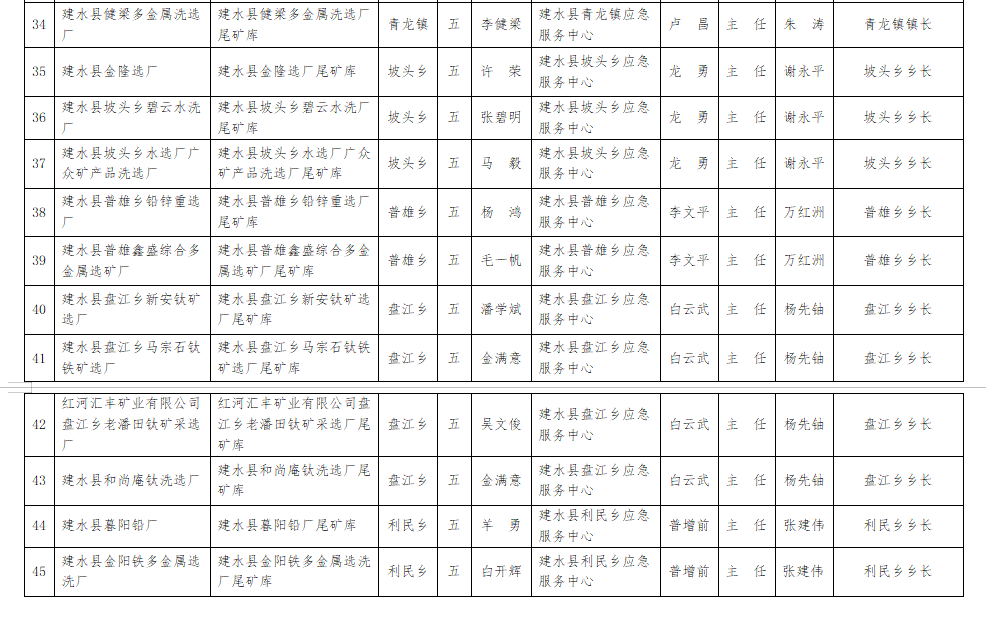 根据《中华人民共和国安全生产法》《尾矿库安全监督管理规定》《云南省应急管理厅云南省生态环境厅关于印发云南省尾矿库风险隐患排查治理工作方案的通知》《云南省应急管理厅关于实施尾矿库安全生产包保制度的通知》的相关规定及要求,为切实落实尾矿库安全生产包保责任,现对《2021年建水县尾矿库安全生产包保责任人一览表》予以公示。请各部门和包保责任人(在下一年公示前,相关责任人发生调整变动,由接替人承担此职责。)认真履行职责,切实做好监管和包保工作,确保尾矿库安全运行。尾矿库企业按此公示做好尾矿库包保责任公示牌的变更工作。